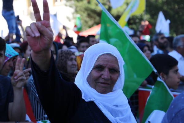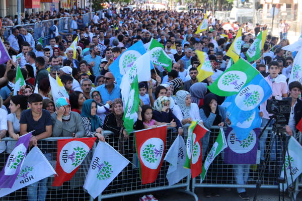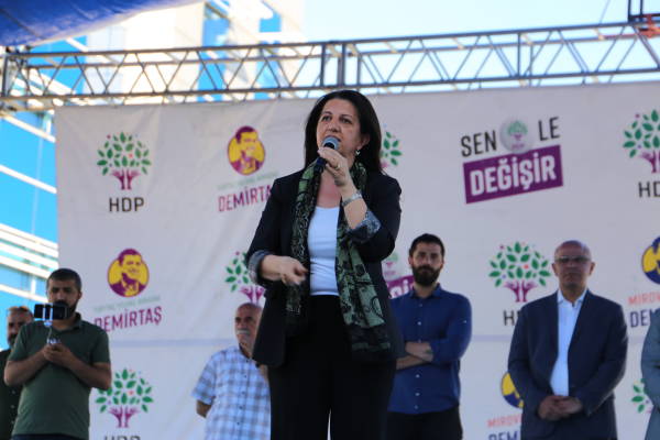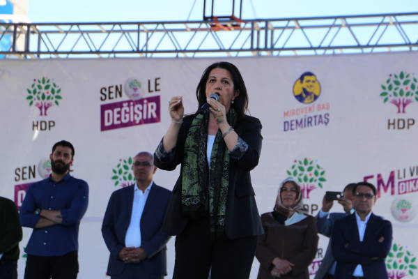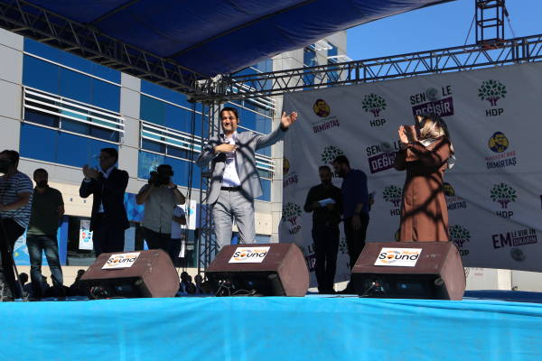После них на сцену вышла сопредседатель ДПН Первин Булдан и сказала: «Этой стране не нужен ни ПСР, ни Реджеп Тайип Эрдоган. ПСР уже начал распределять гуманитарную помощь [чтобы купить голоса избирателей]. Этот город был обречен на нищету. Помощь, которую поставляет ПСР, режим купил на народные деньги. Таким образом, вы можете получить эту помощь, но не голосовать за ПСР».