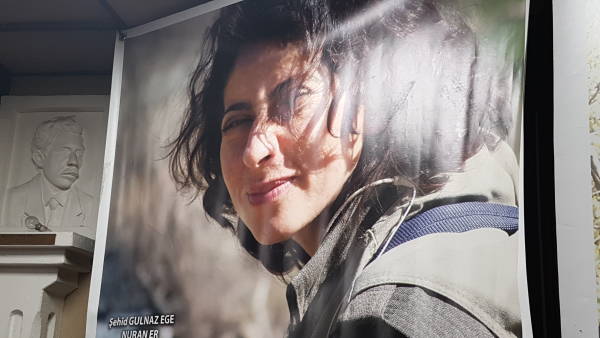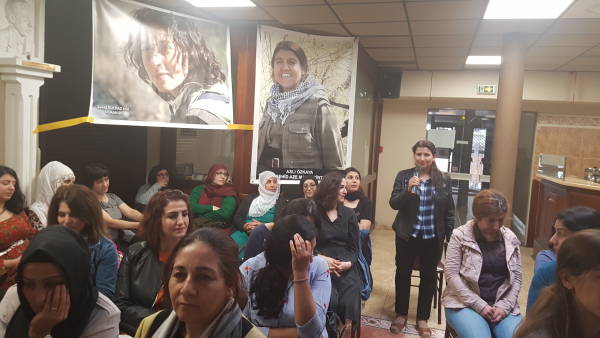 Зал был украшен фотографиями курдских женщин-политиков, убитых в Париже, – Сакине Джанзиз, Фидан Доган и Лейлы Сайлемез, а также курдских героинь Гюльназ Эге (Нуран Эр), Асли Озкая (Аз Аз Малазгирт) и Беритан.