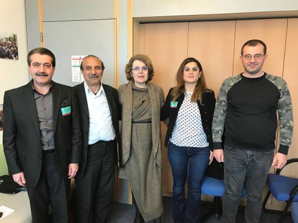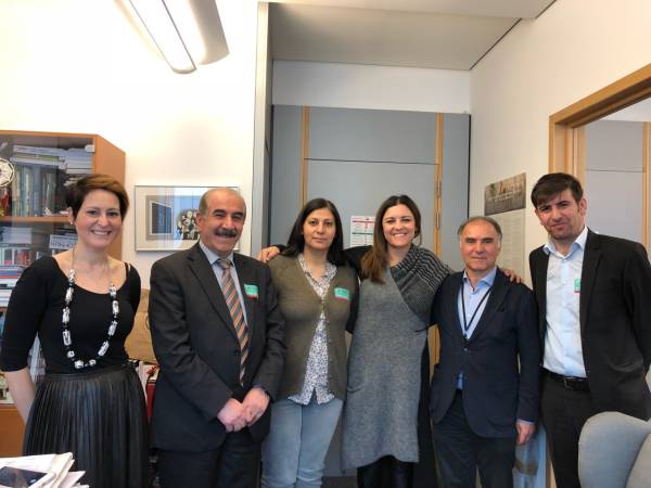 Делегация состояла из представителей Демократической Партии Народов (ДПН) в Европе Эйюп Дору, сопредседателя Конгресса демократического общества в Европе (КДО-Е) Юкселя Коча, представителя Движения женщин Курдистана в Европе Дильш Осман, члена Патриотического союза Курдистана (ПСК) Тофика Наджима, члена Конфедерации турецких рабочих в Европе Озана Демира, сопредседателя Ассамблеи диаспоры Шенгала Фикрета Игрека, члена бельгийской платформы за Африн Эрена Коча, участника движения «Горран» Мустафы Ранждара Макхдада. Делегация провела встречу для обсуждения ситуации с европейским докладчиком Еврокомиссии по Турции Кати Пири и председателем партий «Европейские левые» и «Северные лево-зеленые» Габриэлем Зиммером, а также членами христианских и либеральных групп.