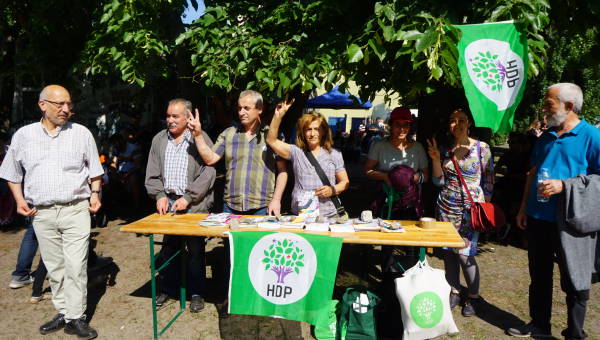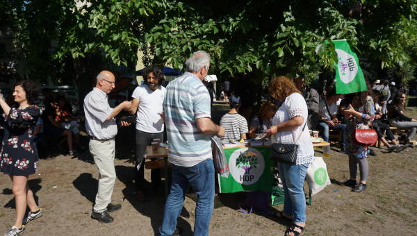 У стенда были распространены листовки с информацией о предстоящих выборах в Турции.