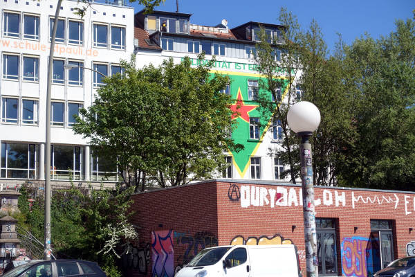Мы изобразили на фасаде нашего дома символ, который порой является весомой причиной для полицейских рейдов, обысков, задержаний, допросов и расследований. Запрет на РПК никому не помог, кроме нынешнего президента Эрдогана. Внешнеполитическое лицемерие Федерального правительства и его деловые отношения с Турцией не устраивают здесь многих граждан.