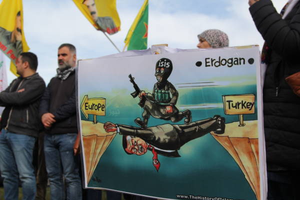 На протесте были подняты баннеры и плакаты, гласившие: «Турция убивает курдов, ООН продолжает молчать», «Вчера Кобане сегодня Африн», «Вчера ИГИЛ сегодня Турция», «Турция убивает, а Европа, НАТО и ООН молчат». Собравшиеся скандировали лозунги «Эрдоган убийца», «Турция оккупант».