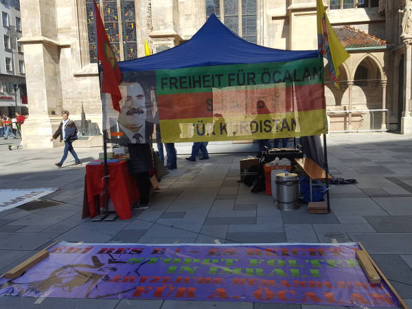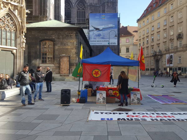 В австрийской столице была установлена информационная палатка в знак протеста против международного заговора 9 октября против курдского национального лидера Абдуллы Оджалана. Активисты будут раздавать листовки на английском и немецком языках, информируя об изоляции Оджалана до 9 октября, когда акция завершится после заявления для прессы.