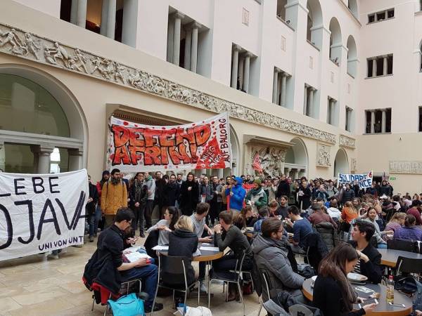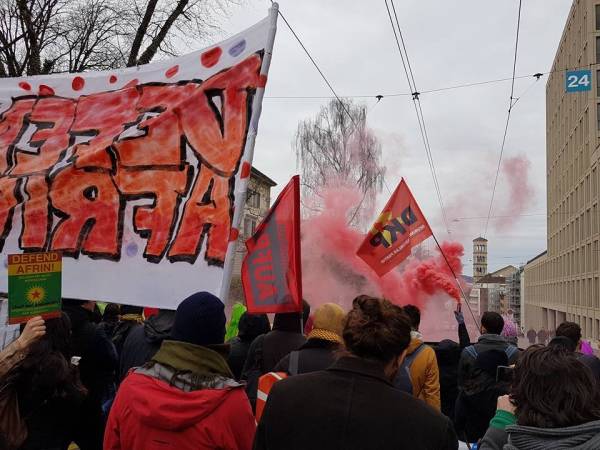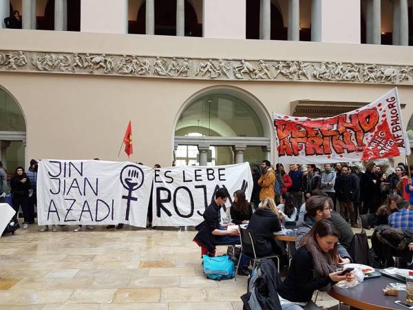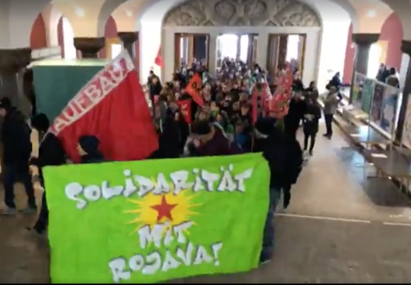 Сотни студентов и преподавателей Цюрихского университета откликнулись на призыв университетской студенческой ассоциации «Поддержим Африн!». Еще до начала акции, большой плакат с надписью «Поддержим Рожаву» был развернут в местном кафе. Протестующие скандировали: «Турецкая армия вон из Курдистана», «Европа финансирует, а Турция устраивает резню» и «Везде Африн, везде сопротивление», также в поддержку Африна писали сообщения со словами солидарности на стенах.