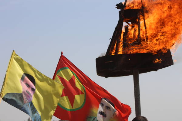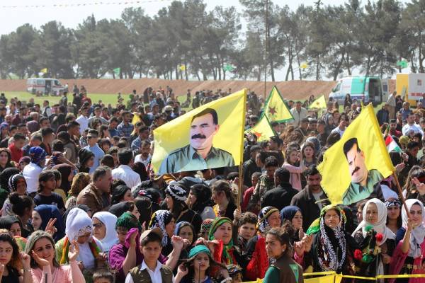 Люди развернули плакаты с изображением курдского народного лидера Абдуллы Оджалана, принесли флаги ОНС/ЖОС и фотографии героев, павших в Сопротивлении Века в Африне.