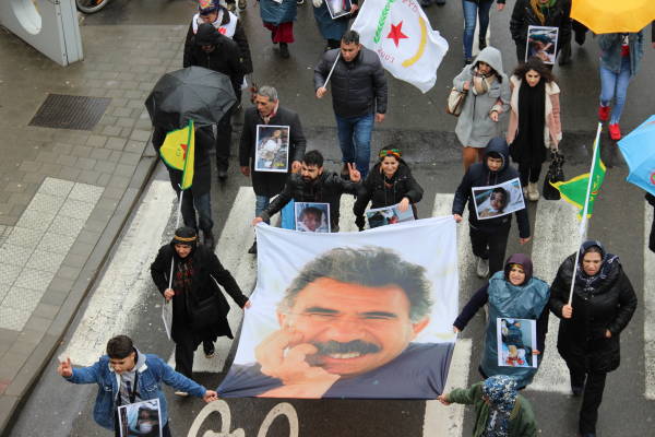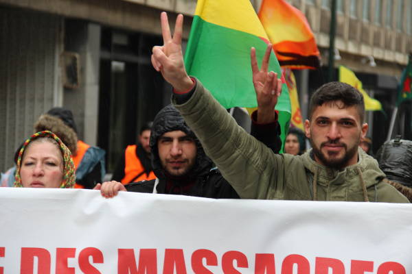 Демонстранты собрались перед Северным железнодорожным вокзалом Брюсселя под флагами ОНС и Рожавы. Они также несли плакаты с портретом лидера курдов Абдуллы Оджалана, турецкого революционного лидера Ибрагима Кайпаккая и баннеры с лозунгами, осуждающими Эрдогана и Турцию.
