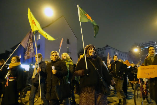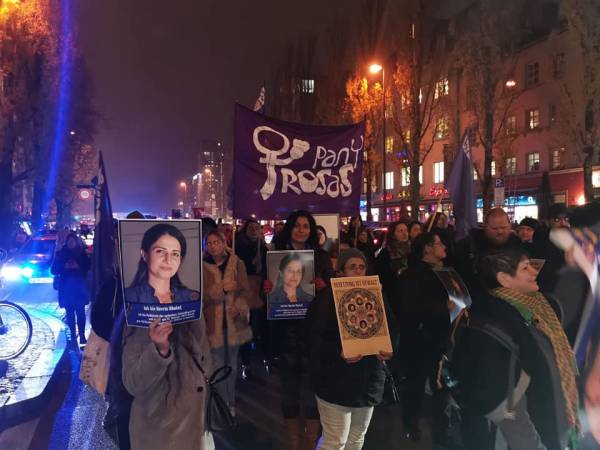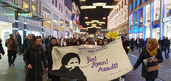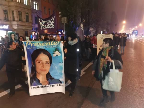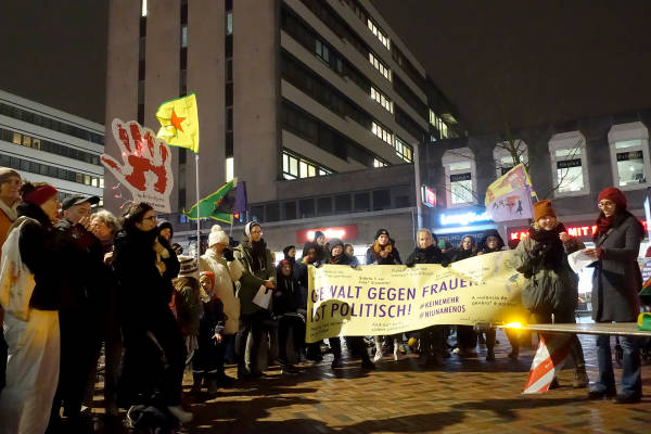 Скандируя лозунги против мужского насилия, женщины в Гамбурге несли баннер с фотографией Сакине Кансиз, которая была убита в Париже 9 января 2013 года вместе с представителем НКК (Национального конгресса Курдистана) в Париже Фидан Доган и членом молодежного движения Лейлой Шайлемез.