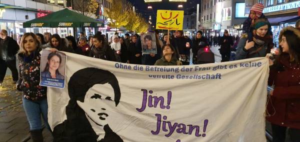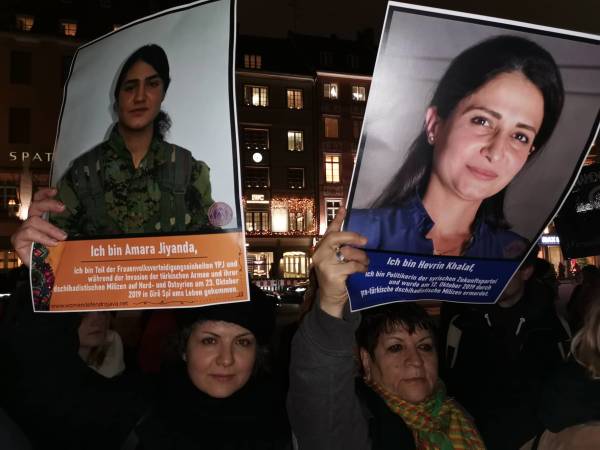 25 ноября в Мюнхене прошла акция, на которой женщины держали баннер с фотографией курдского политика Хаврин Халаф, убитой в Рожаве.