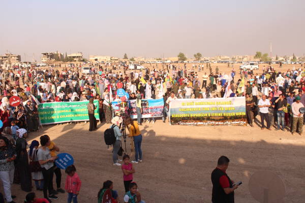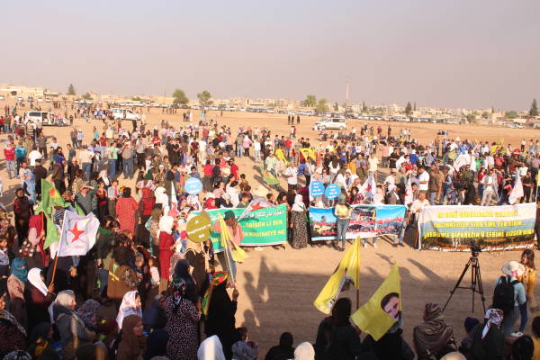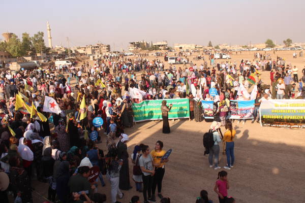 Тысячи жители из региона Джазиры собрались на площади мученика Шебата по призыву совета кантона Камышло и Конгресса «Стар», чтобы выразить протест против нападений турецкого государства на Африн и Южный Курдистан (Башур).