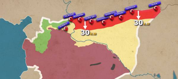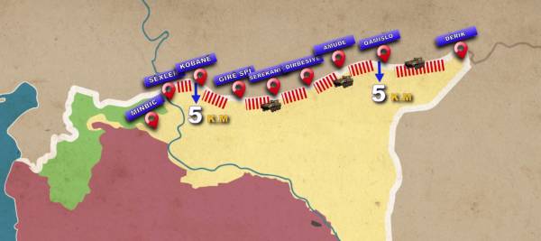 Турция, с другой стороны, предлагает создать зону безопасности на 30–35 километров вглубь региона. Она стремится взять под контроль международный маршрут движения (Ротко), который расположен примерно в 30 километрах к югу от линии, проходящей от Шехлера, Кобани, Гире Спи, Серекания, Дарбасиэ, Амуда, Камышло и Дерика.